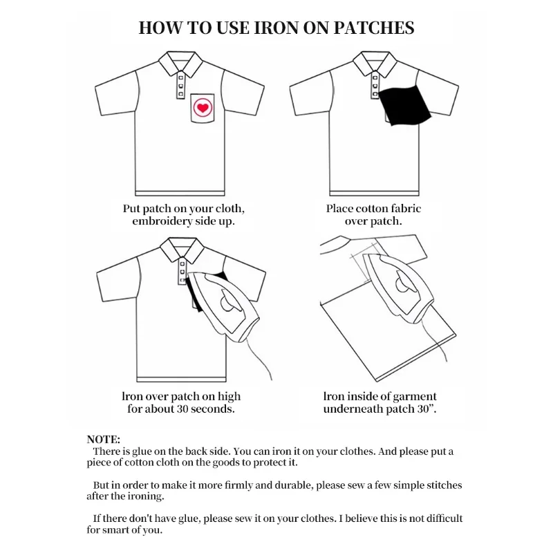 2: Turn the fixed position of the cloth patch together with the clothes, and iron it from the reverse side for 30-60 seconds to ensure that the back glue melts and the cloth stickers are firmly attached to the clothes.